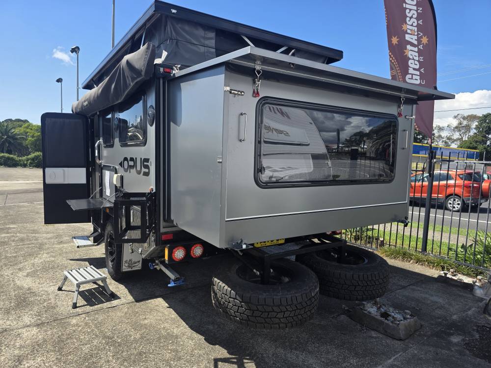 The 2021 OPUS OP13 is a 13-foot, off-road hybrid caravan designed to bridge the gap between a compact camper trailer and a full-featured caravan. It is marketed as "tough luxury," combining a rugged exterior for Australian off-road tracks with high-end interior amenities like a king-size bed and a full internal ensuite.