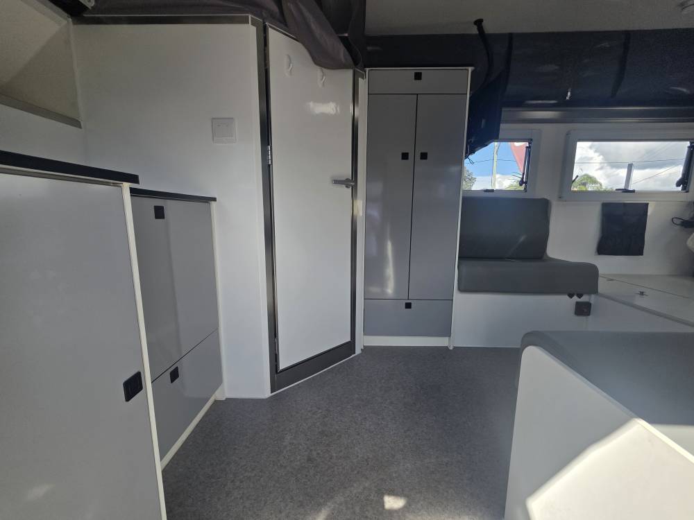 Fridge Space: A dedicated external slide-out tray designed to accommodate large portable fridges (often an optional 95L/96L Evakool dual-zone unit).