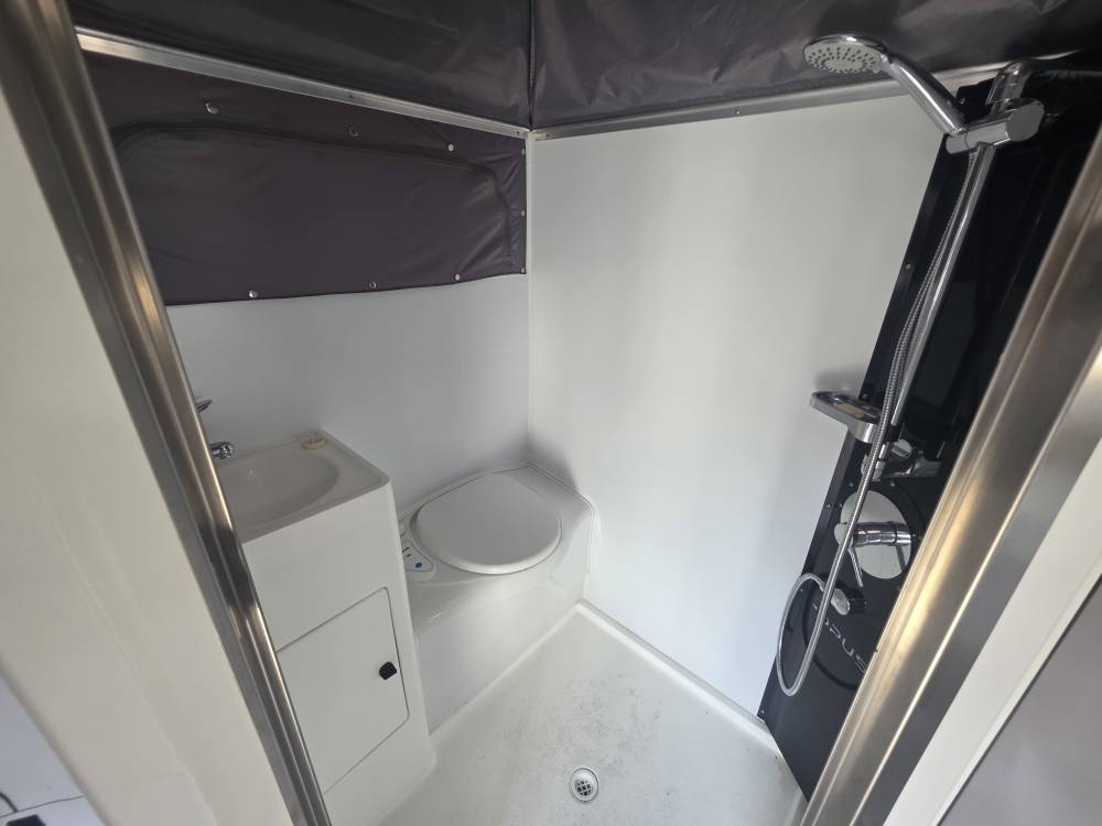 Water: Dual 120L freshwater tanks (total 240L) and a 67L–87L grey water tank.